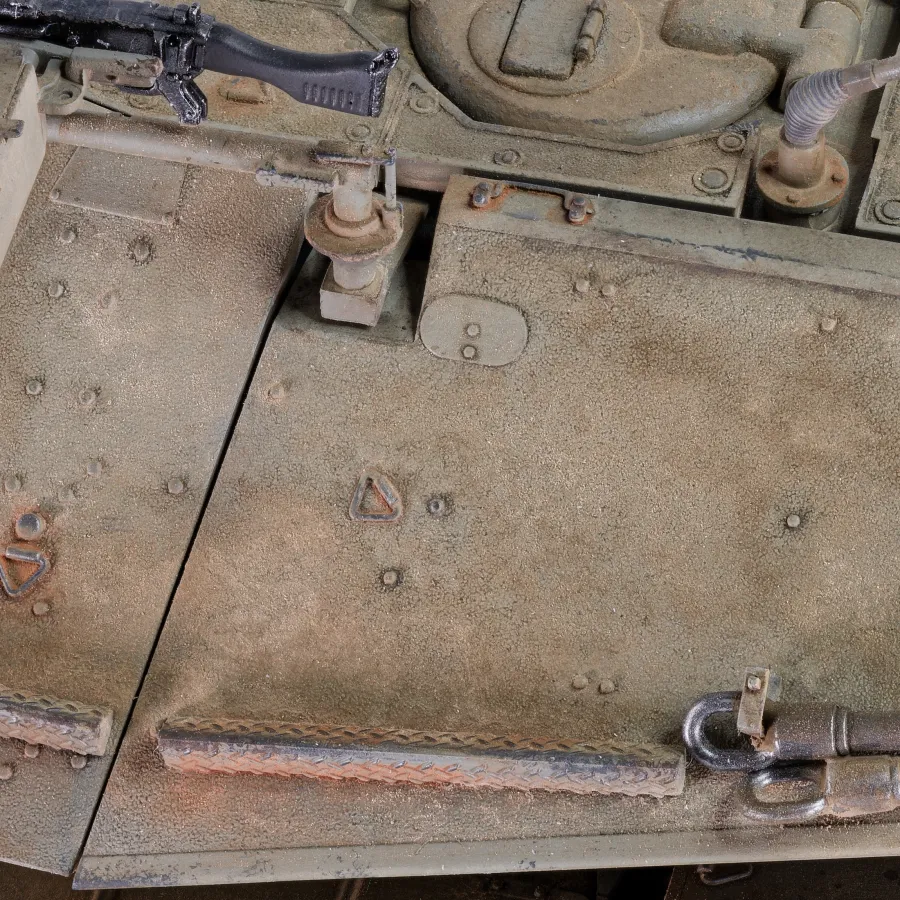 Weathering focused on multiple layers of dust washes, alternating between solvent and water-based mixes, using two colour pairs — Negev Sand + Golan Earth and Brick Dust + Vietnam Earth — with OPR over the top. In some shady spots, especially around the front and back of the hull, the original weathering is obviously nowhere near refined enough, but I’ll live with it now.